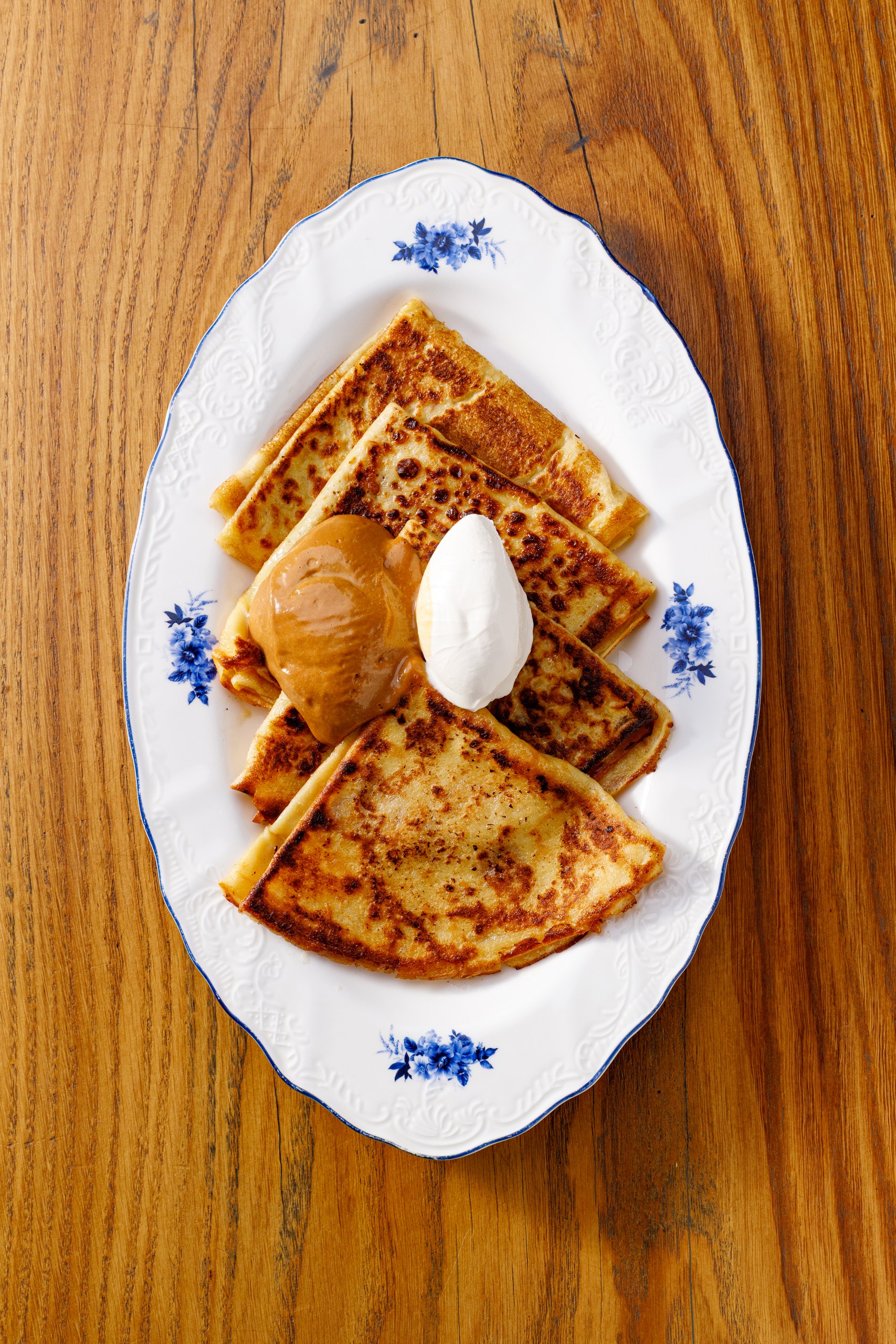 Блины, соус из сгущенки, подвесная сметана, сливочное масло