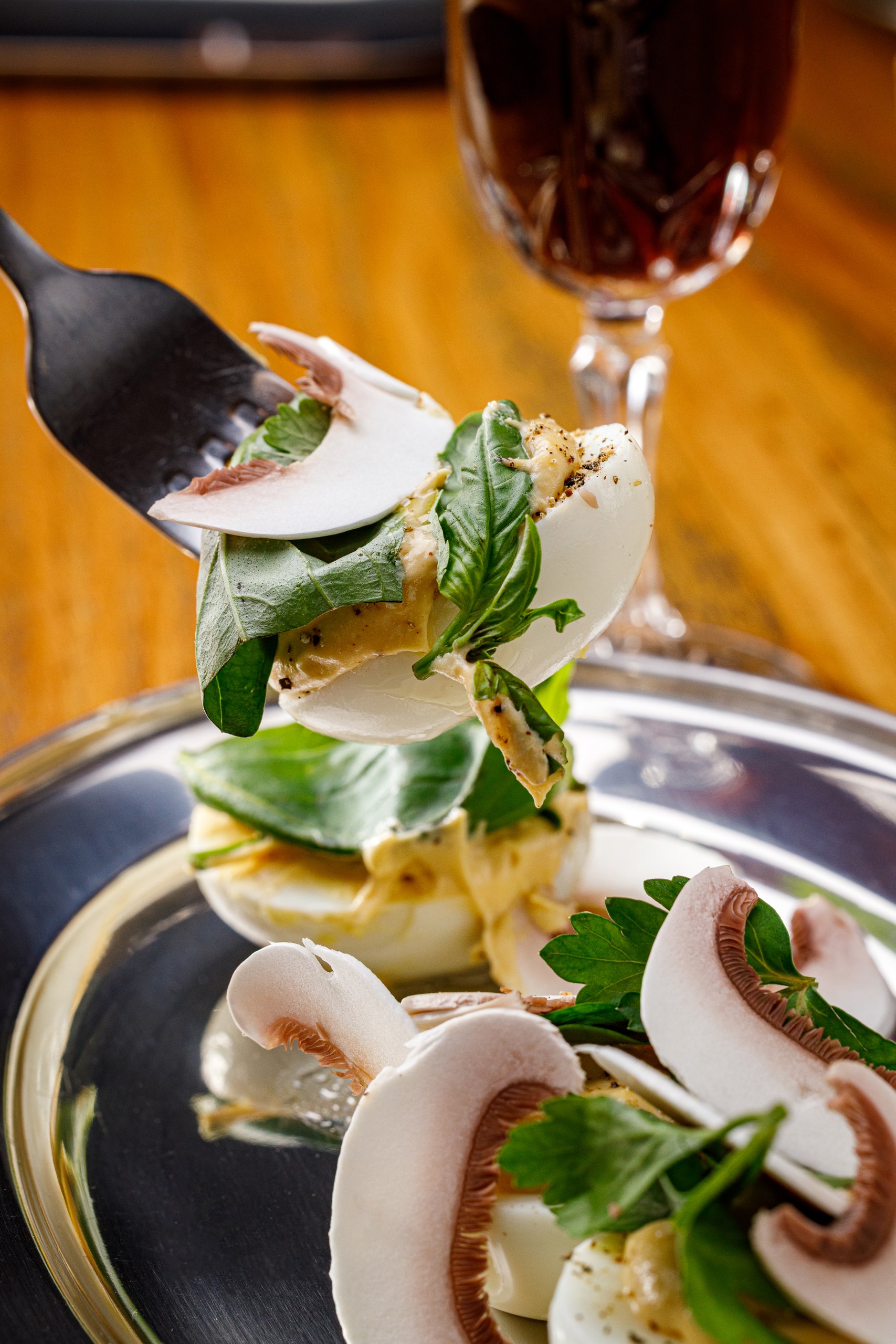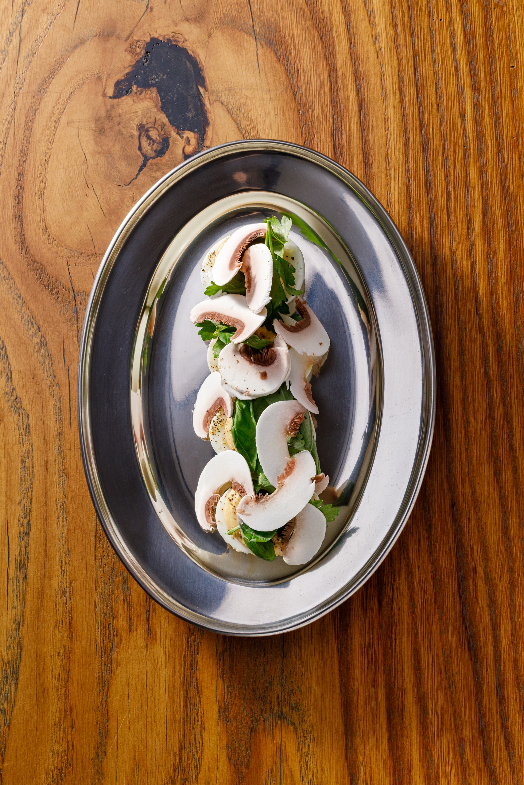Яйца, соус из белых грибов, шампиньоны, трюфельное масло, микс зелени