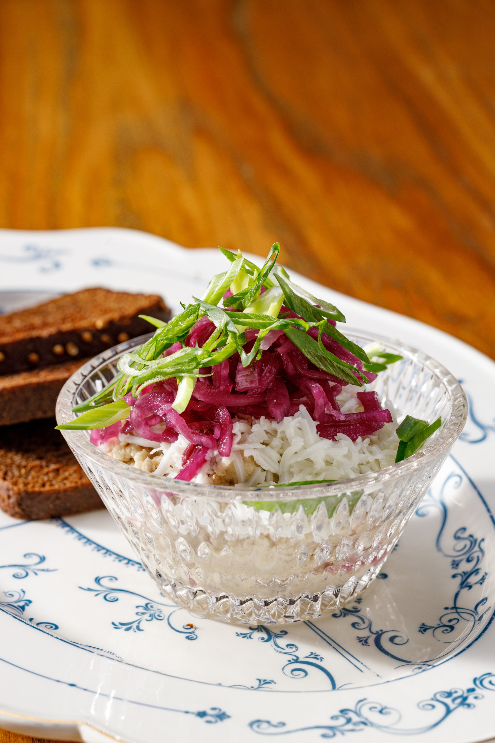 Форшмак, яйцо, темный хлеб,маринованный лук шалот