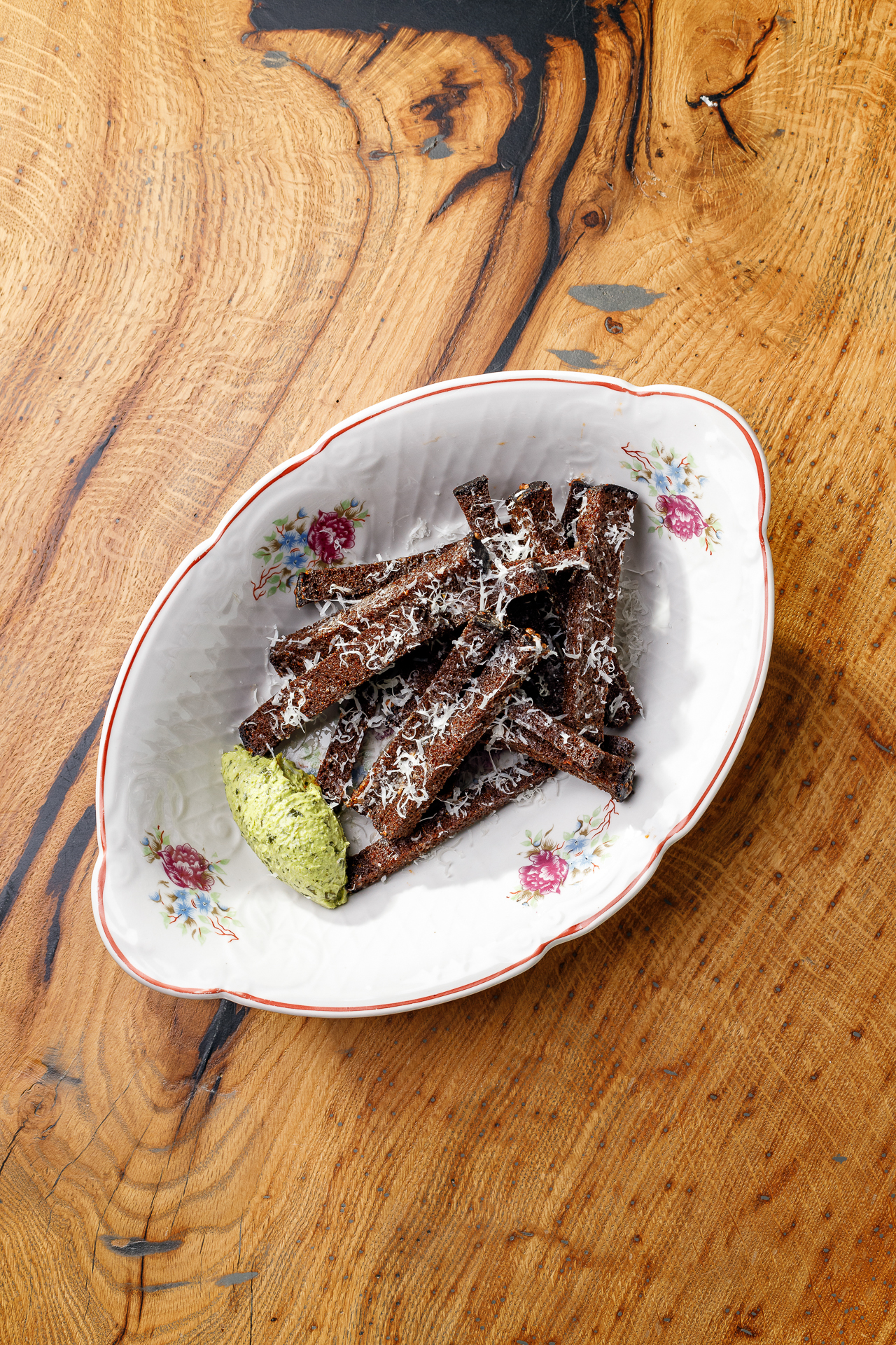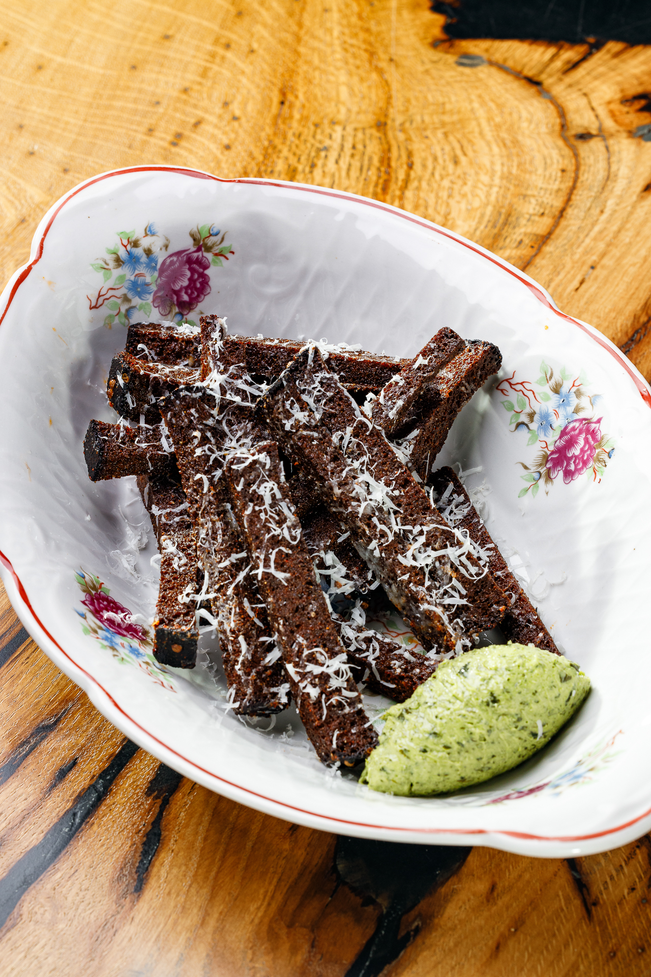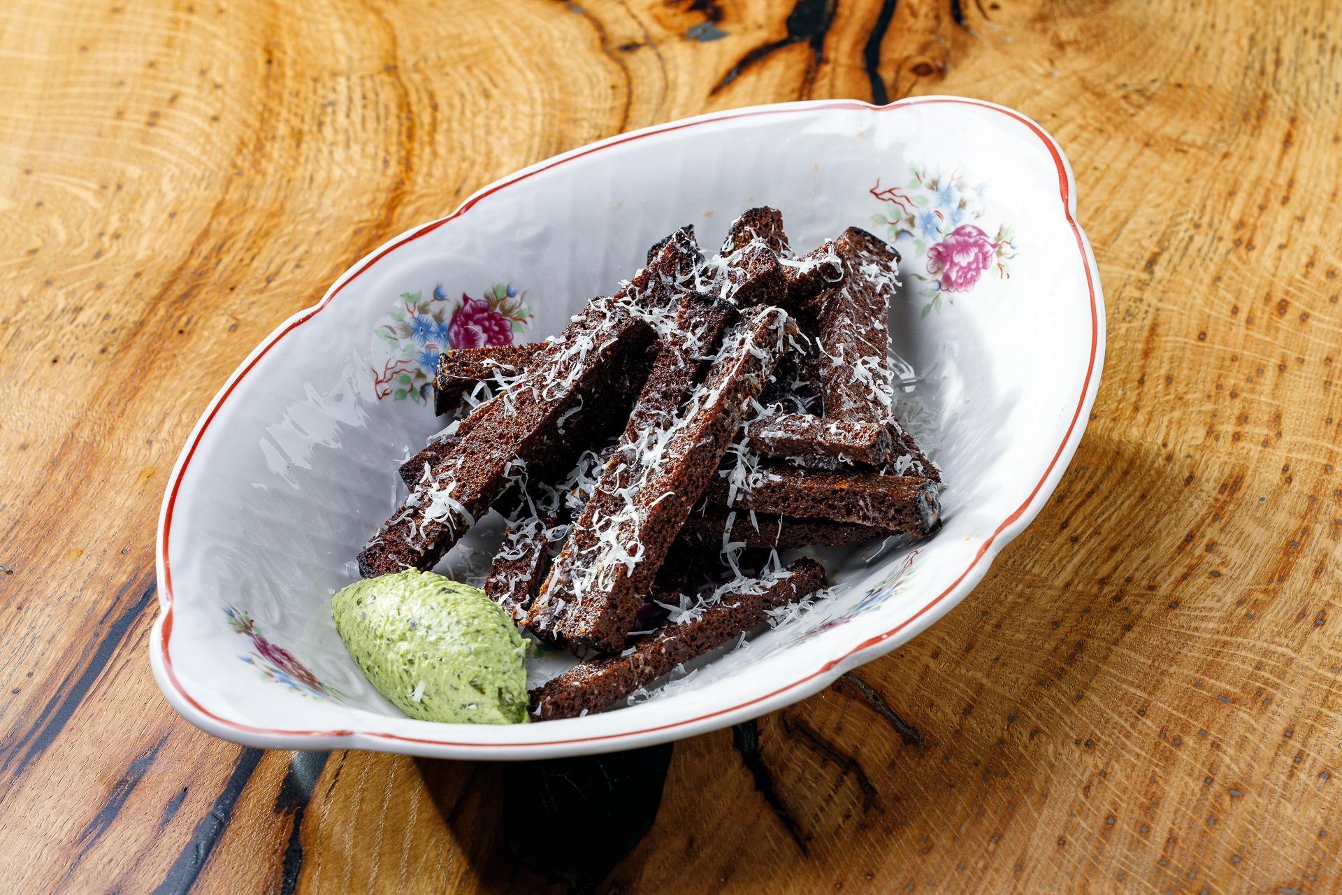 Гренки, пармезан, песто из петрушки, чесночное масло