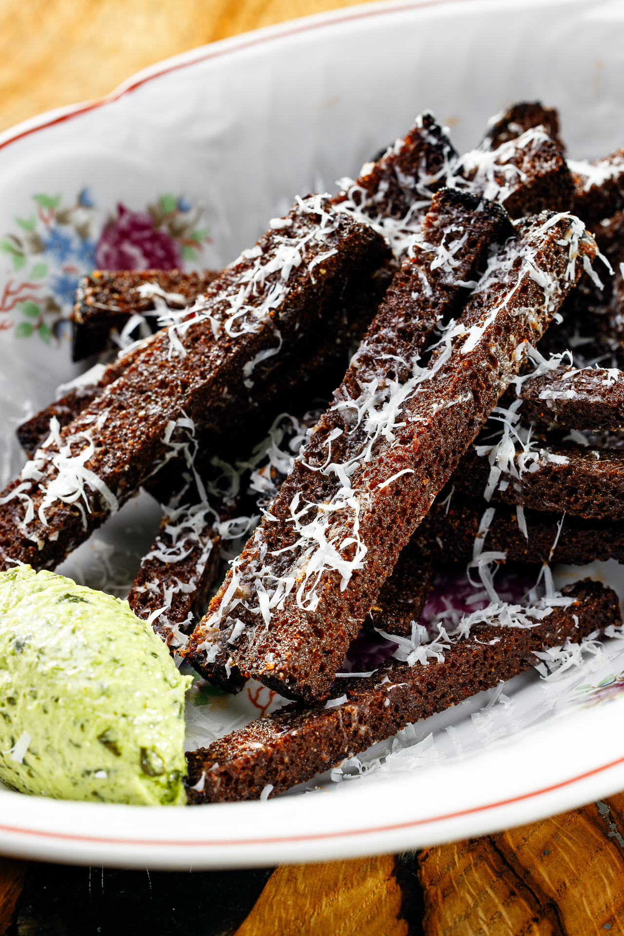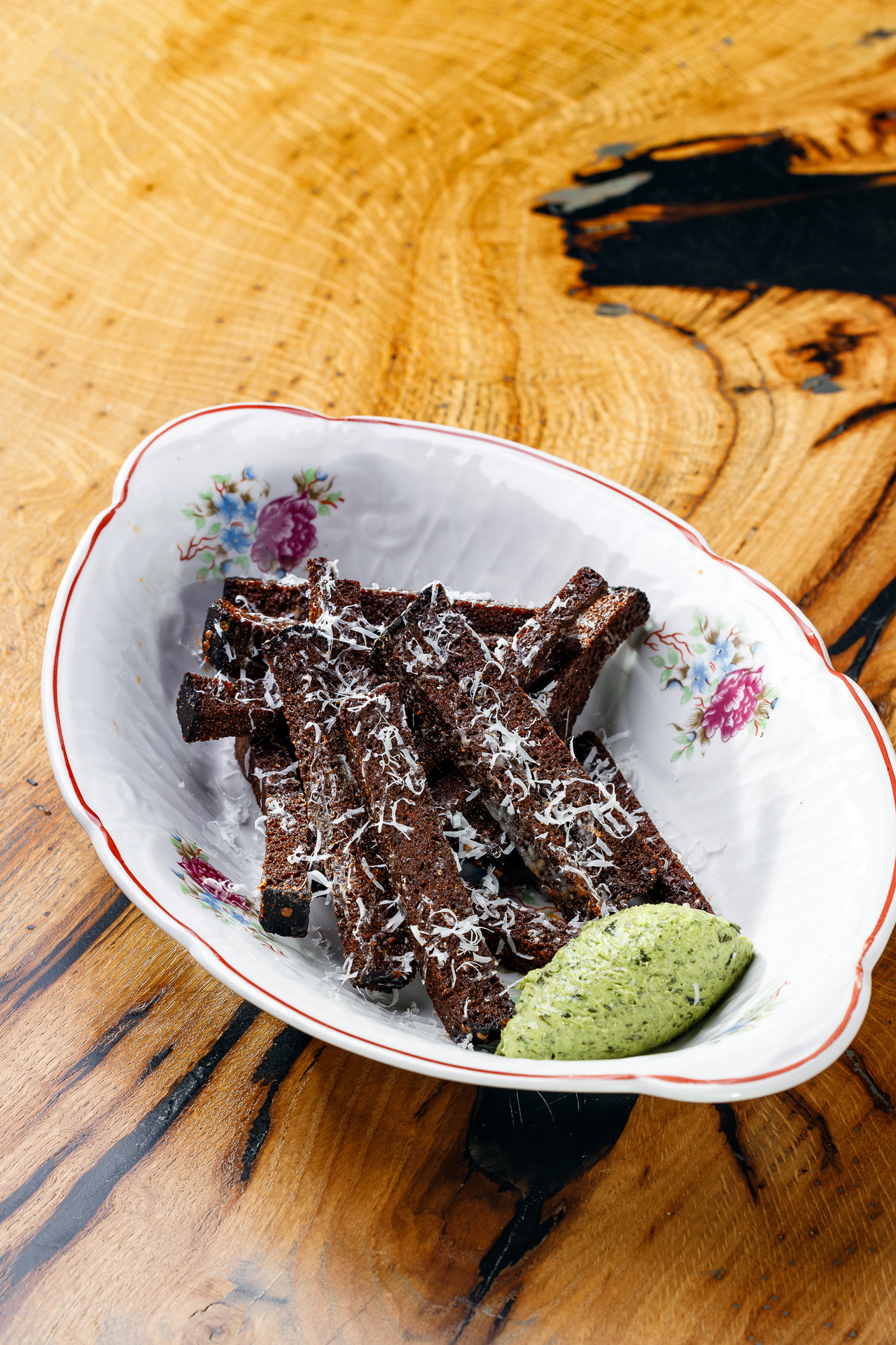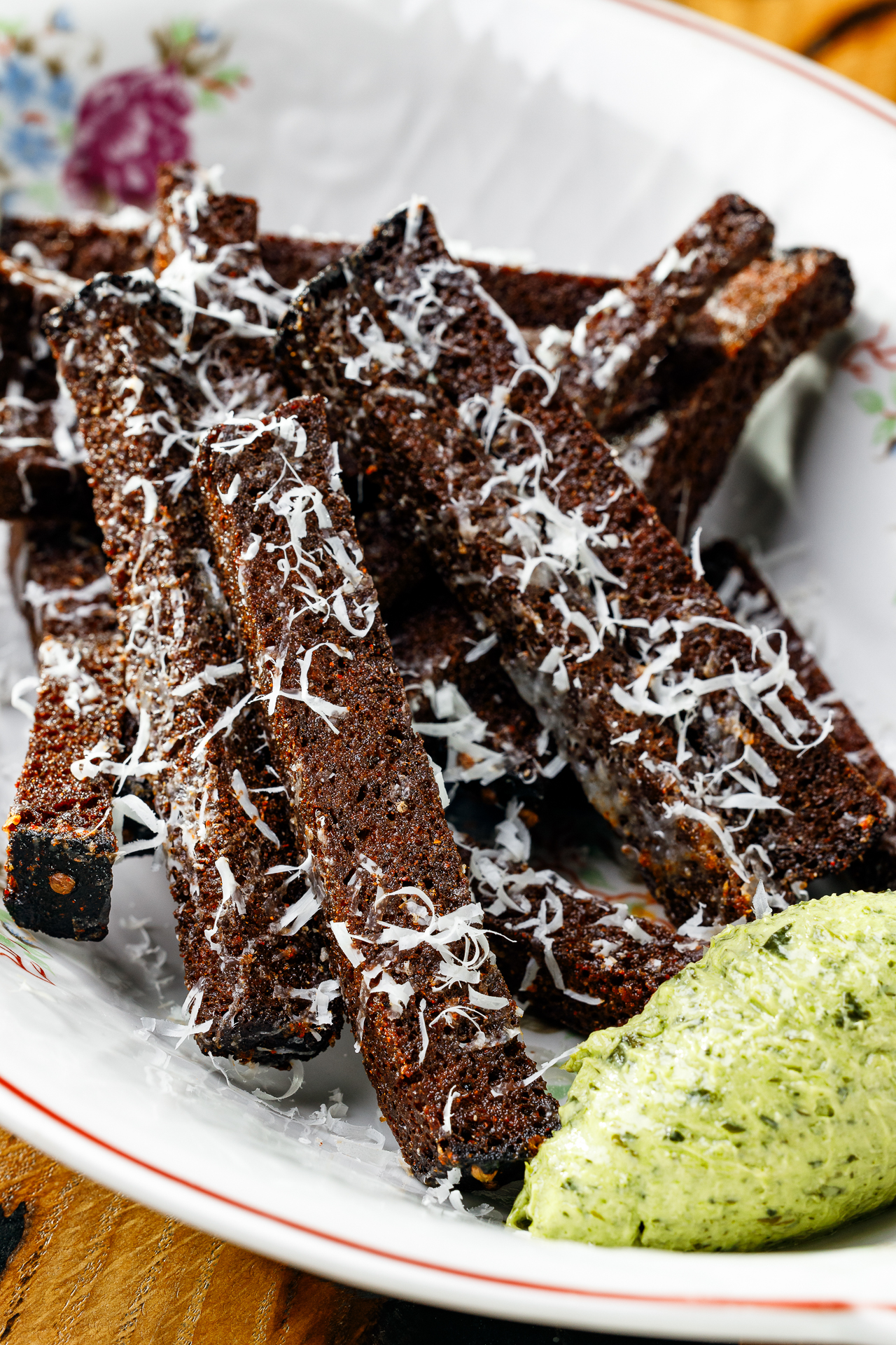 Гренки, пармезан, песто из петрушки, чесночное масло