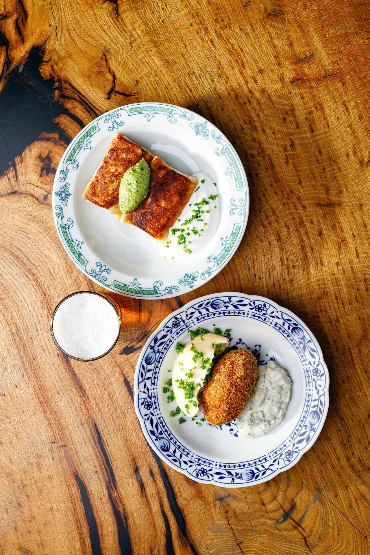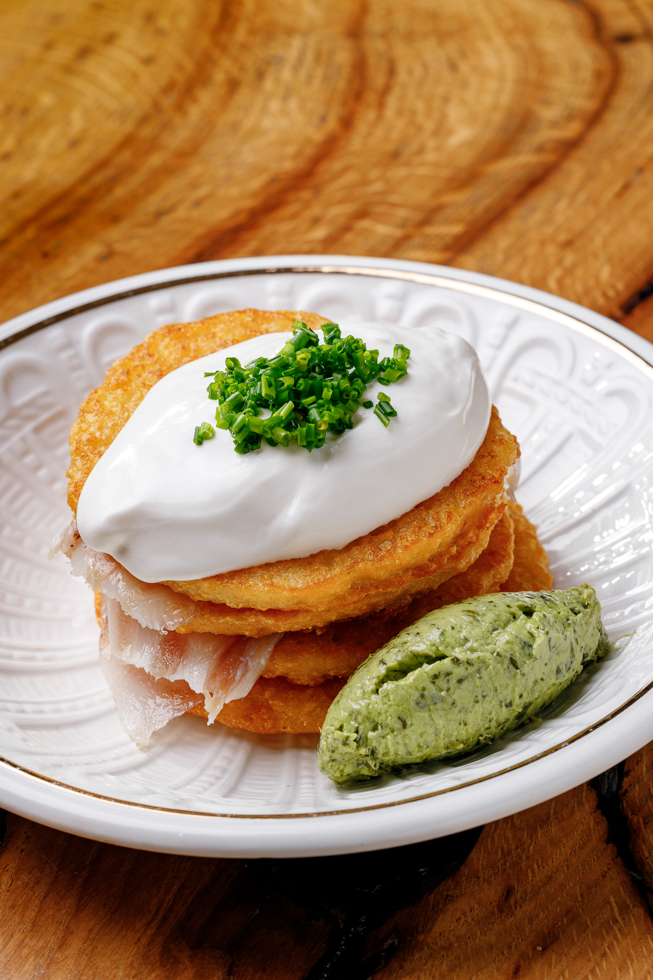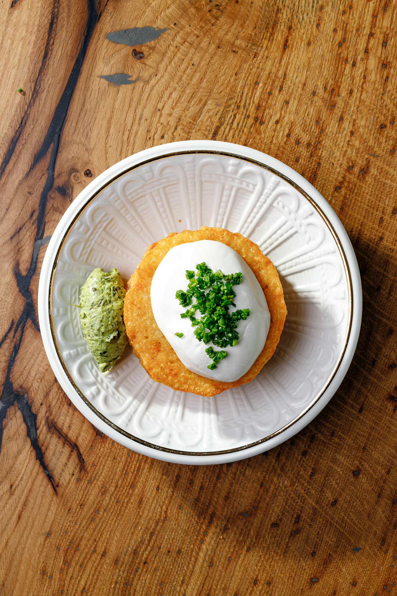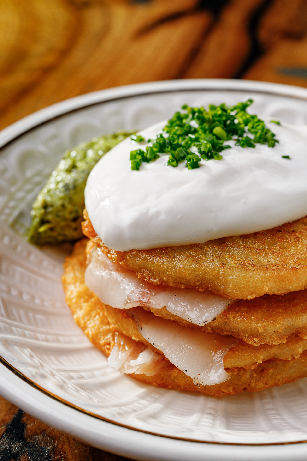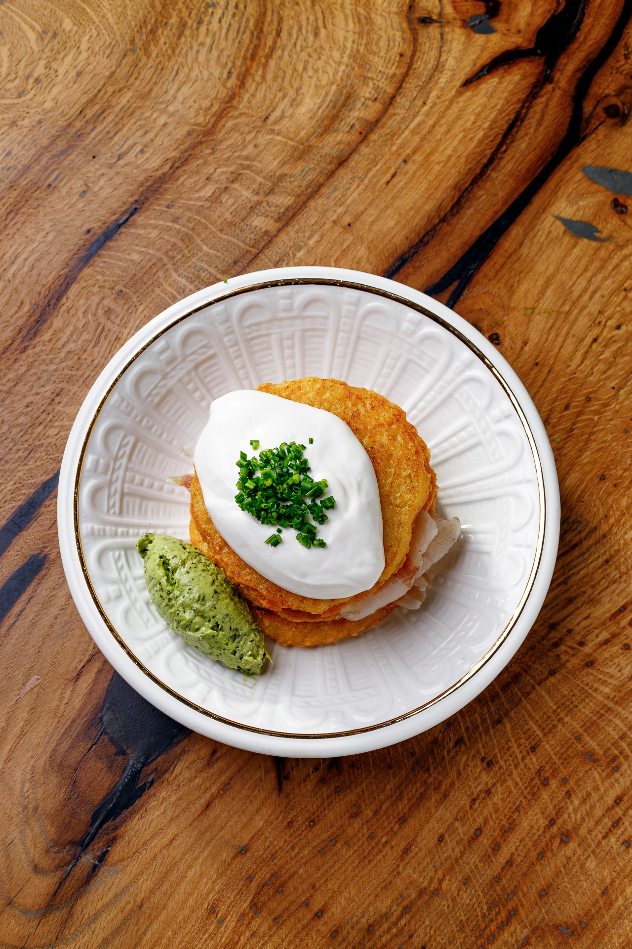 драники, сметана подвесная, песто из петрушки