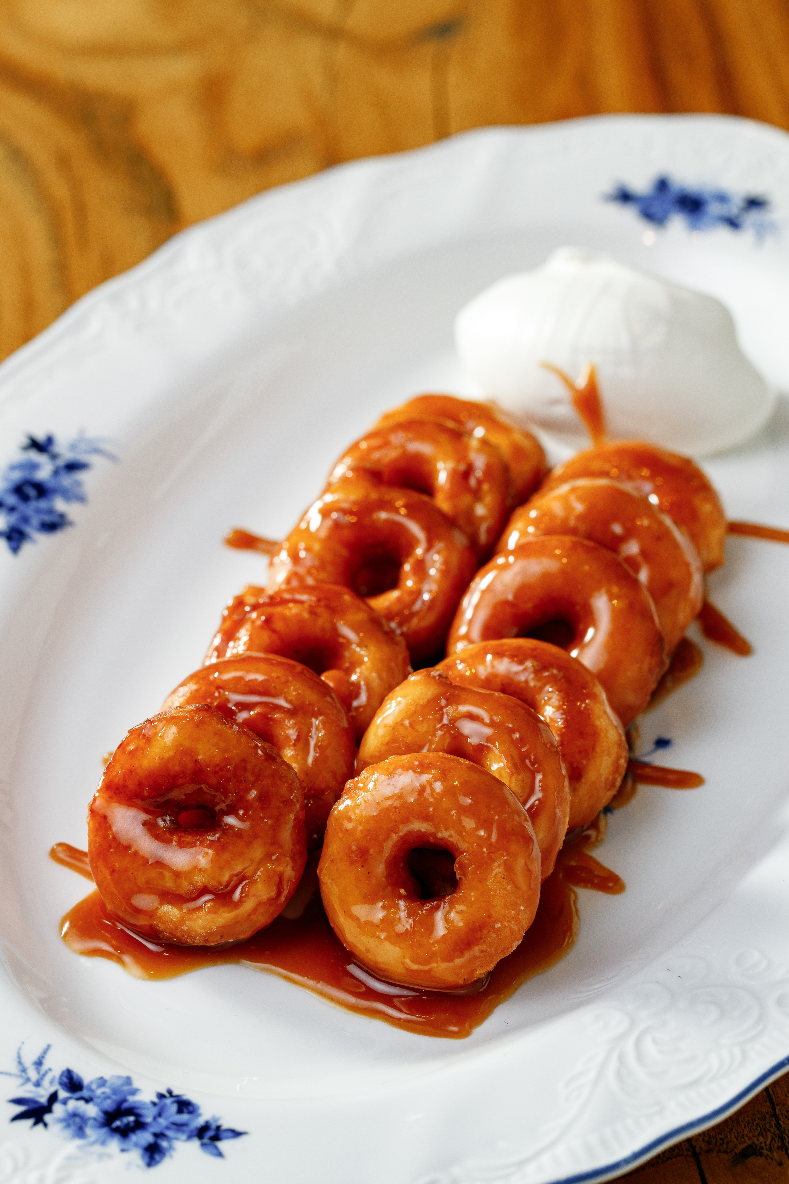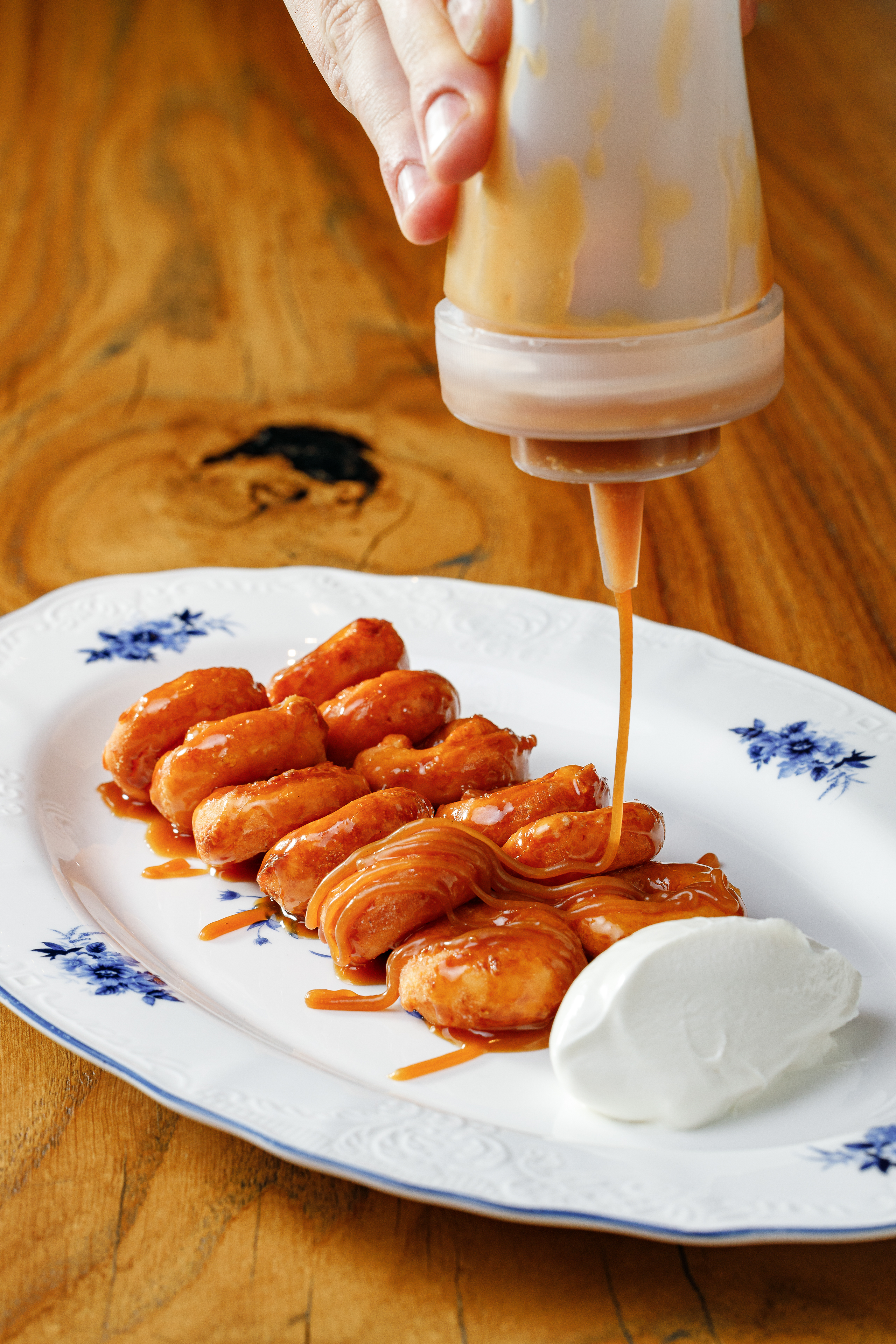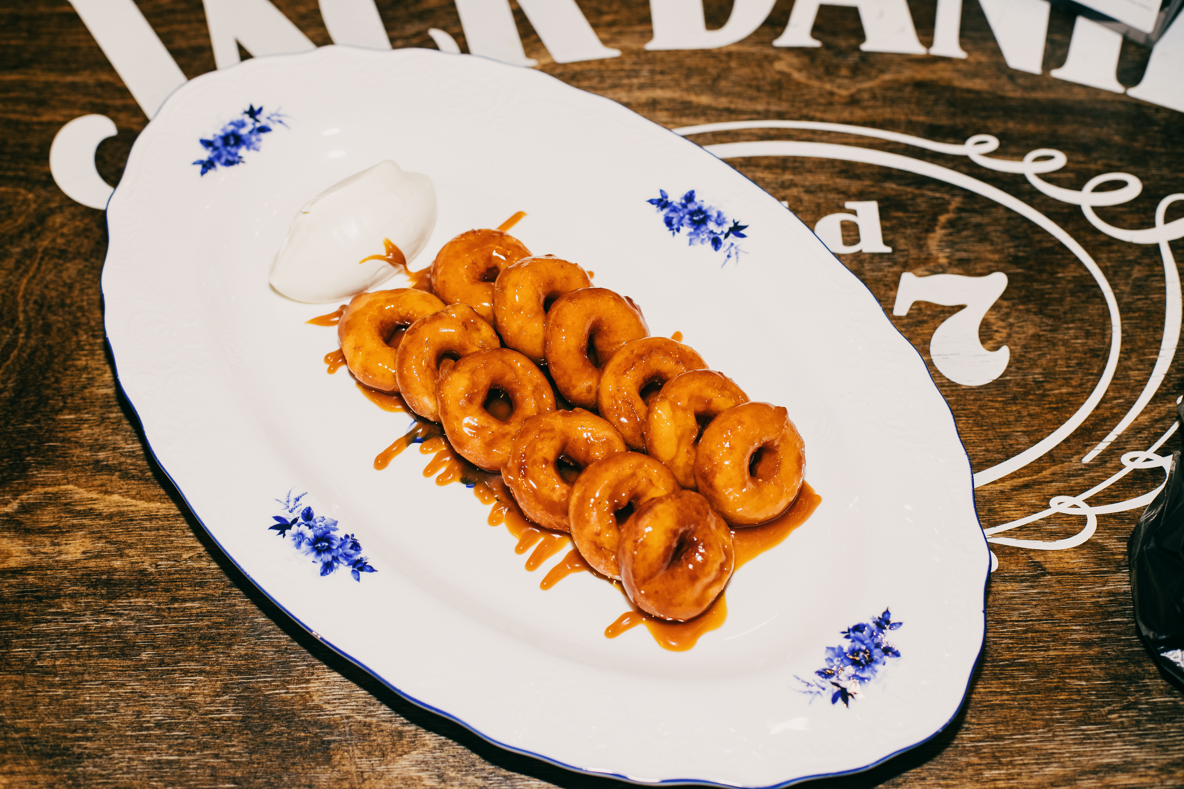 Пончики творожные, мисо карамель, сметана, сахарная пудра