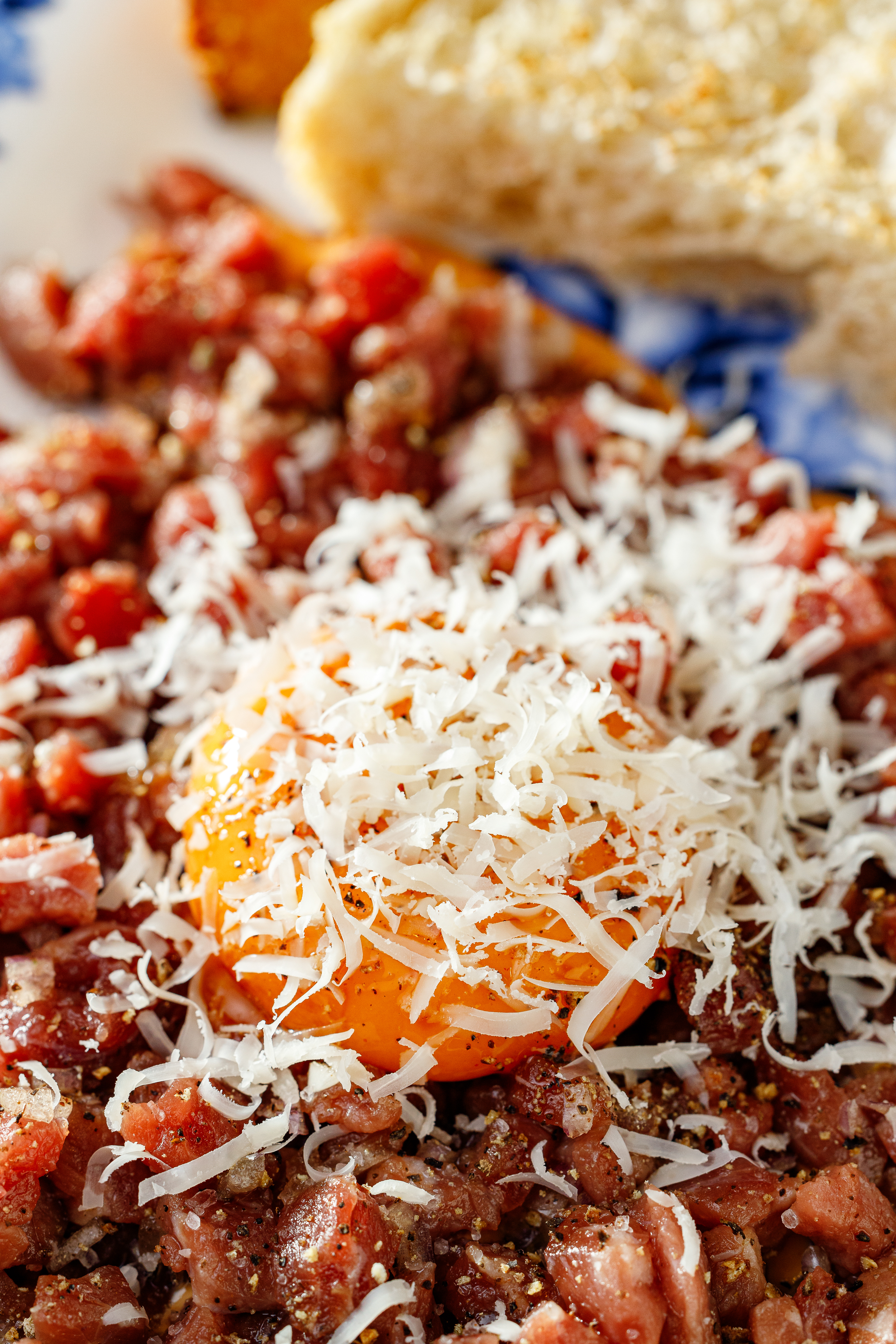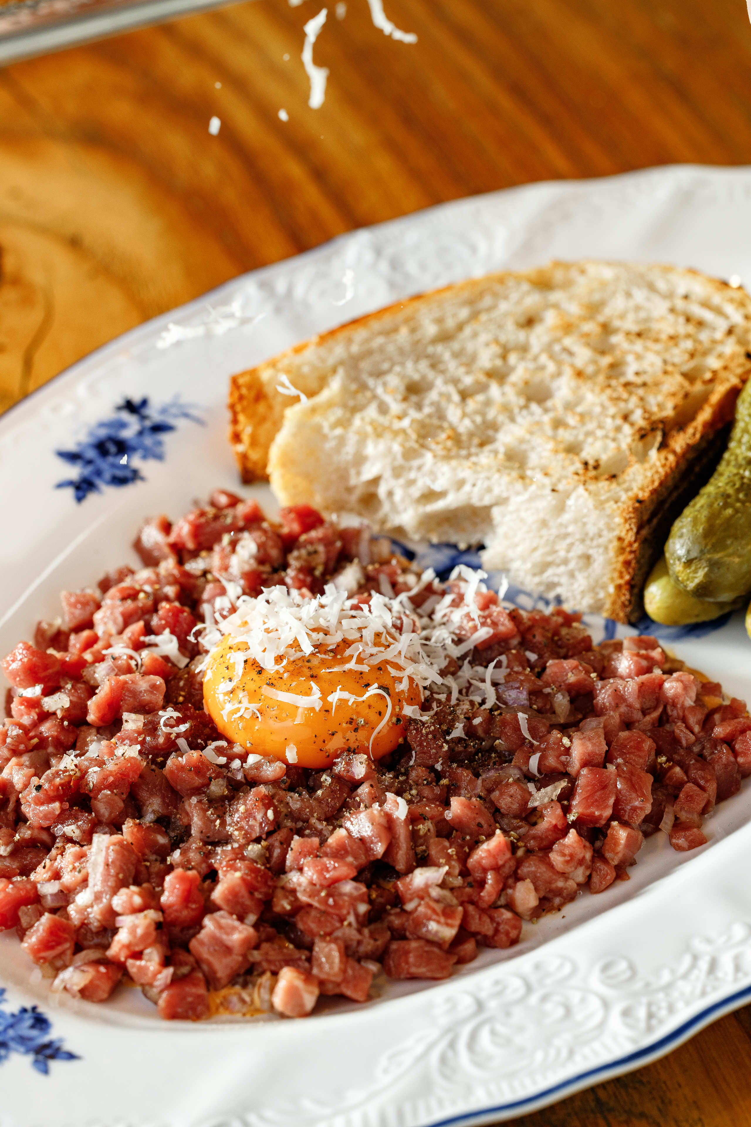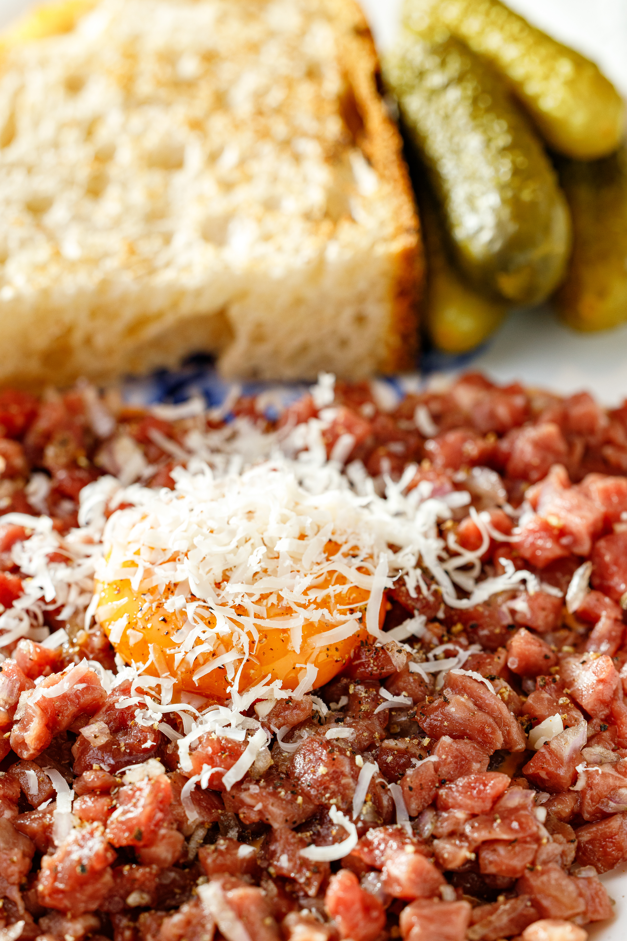 Говядина, мисо соус, желток в соевом соусе, корнишон, пармезан, хлебушек