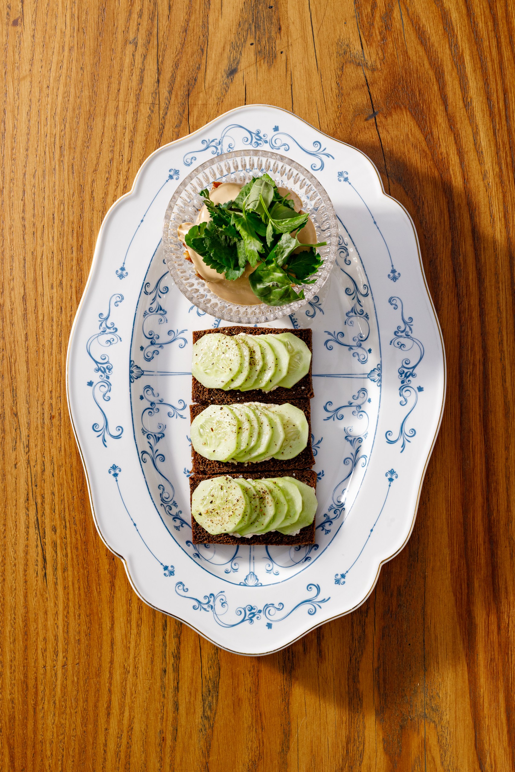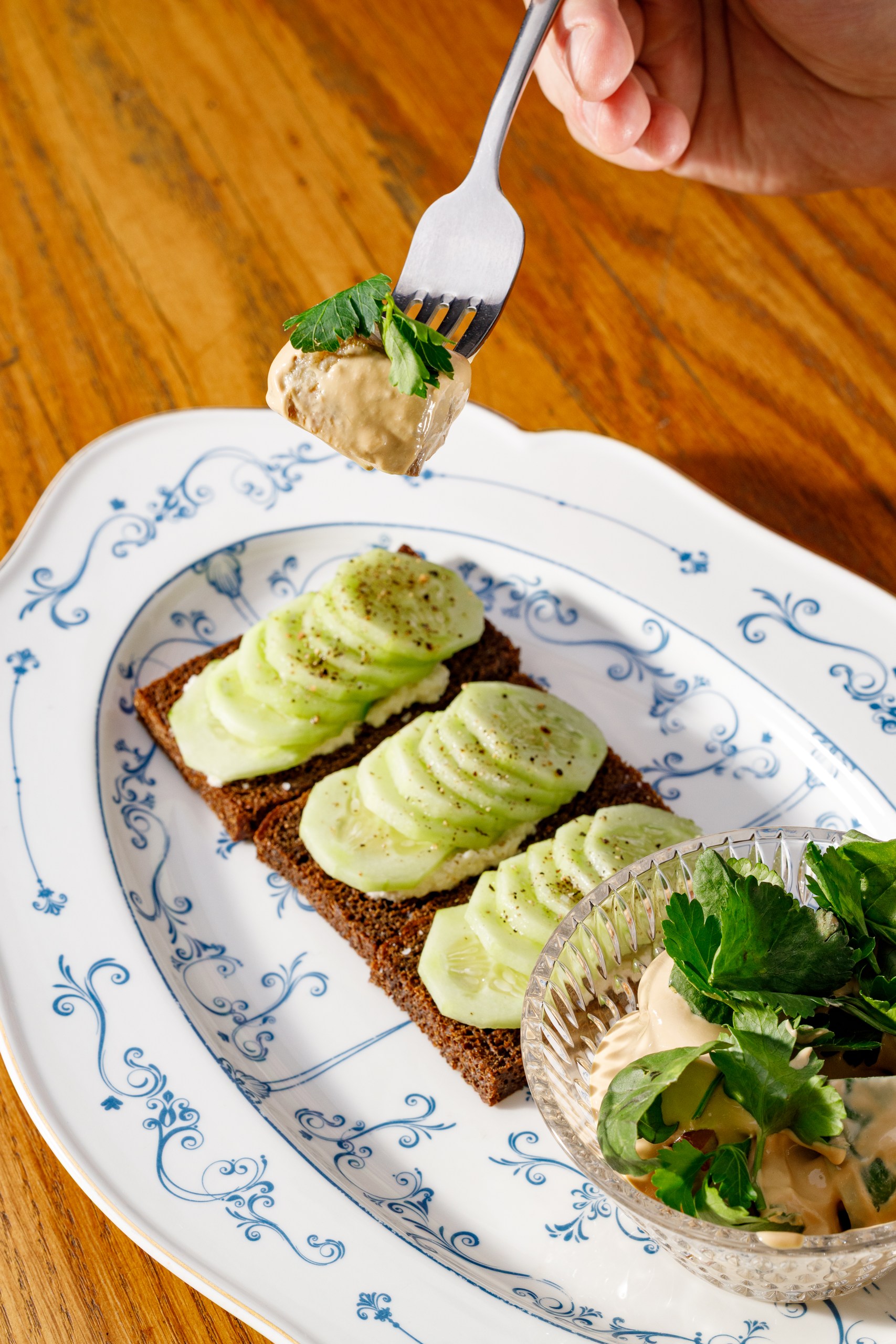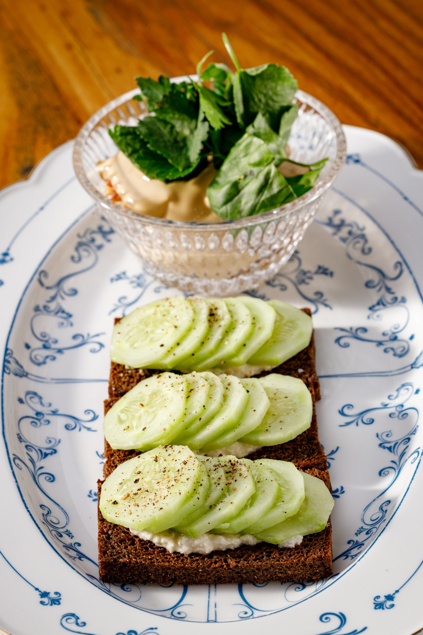 шпроты, крем чесночный, хлеб тартин, лук шалот в черничным пюре, тартар из огурца