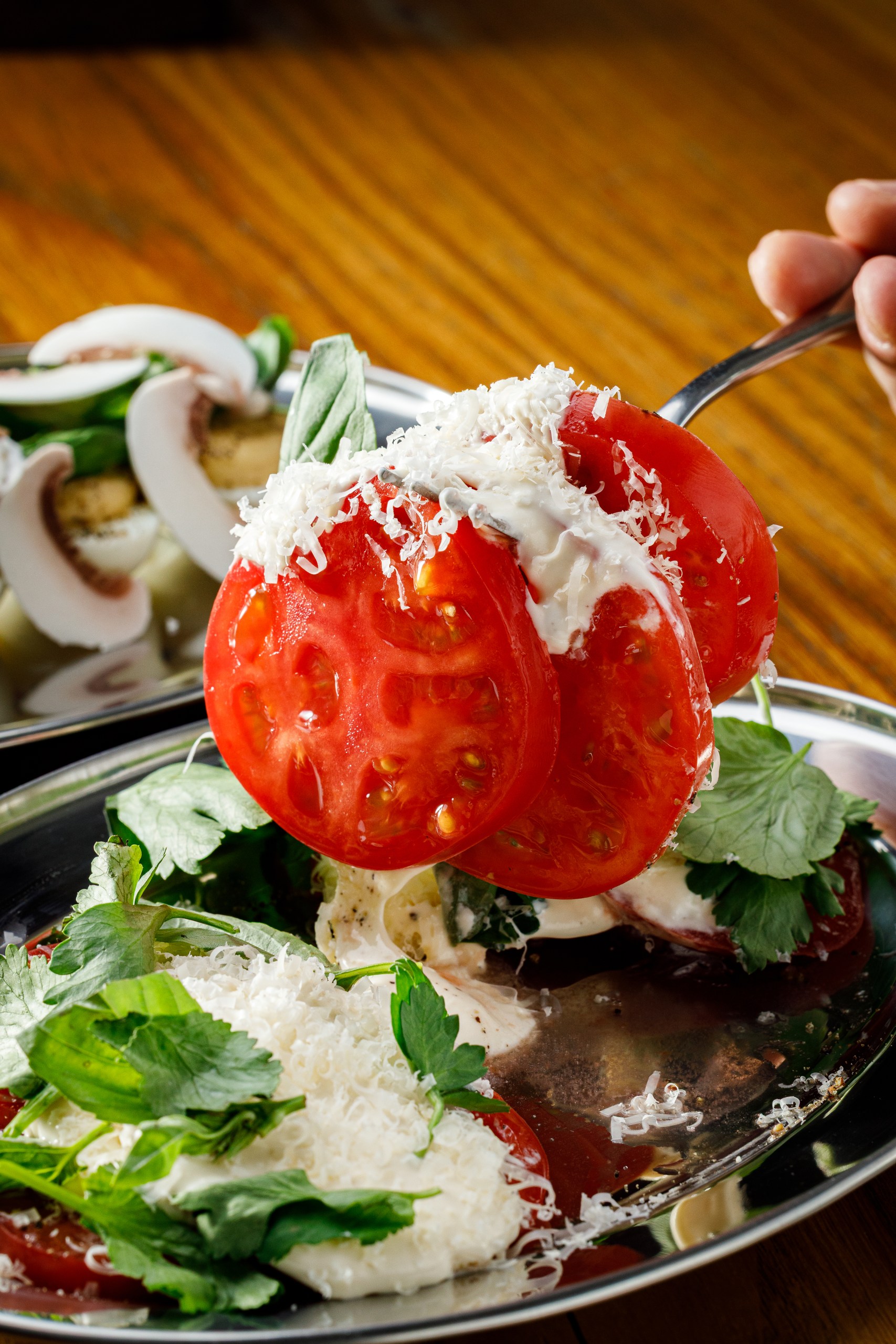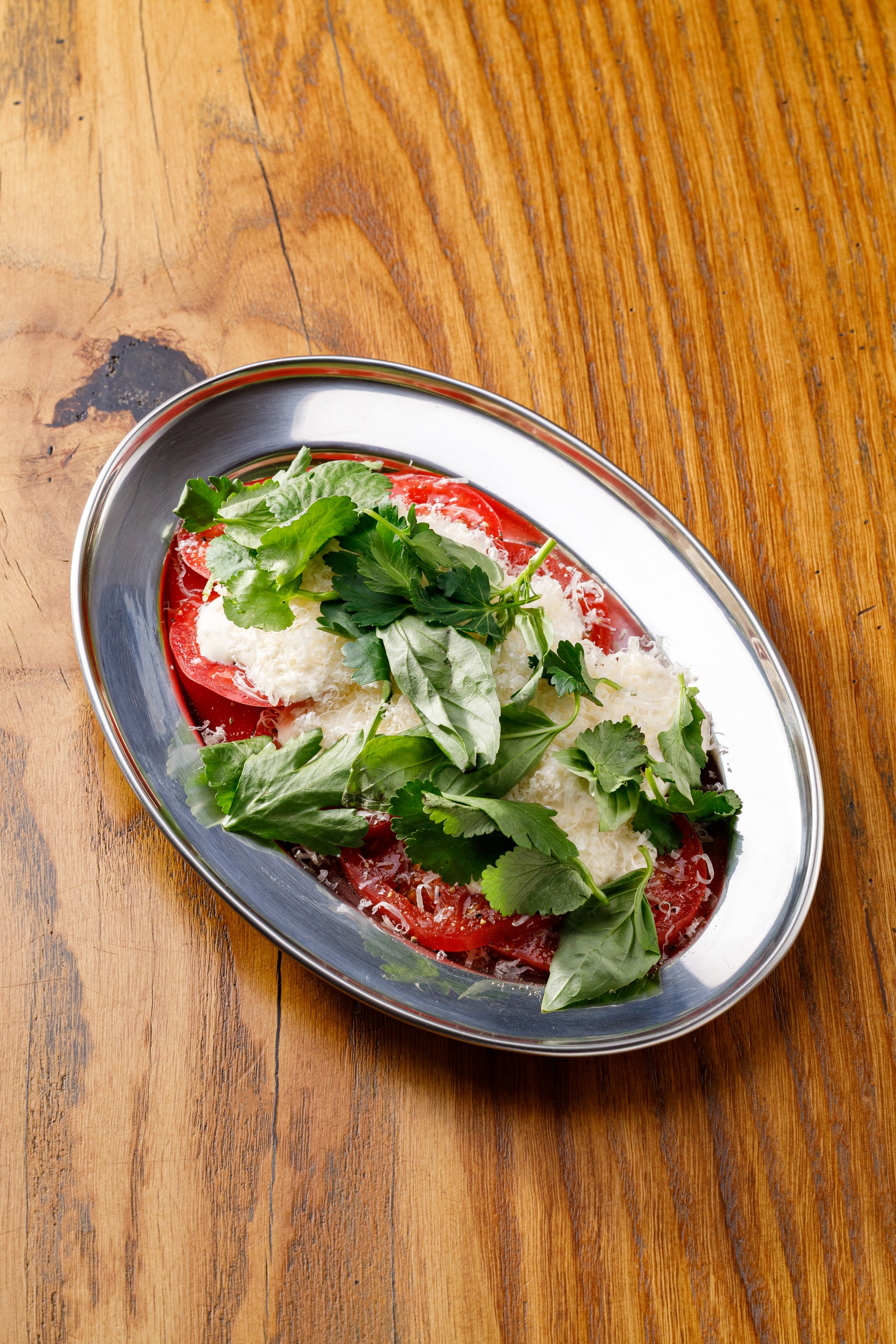 Томаты, чесночный соус с брынзой, микс зелени, пармезан