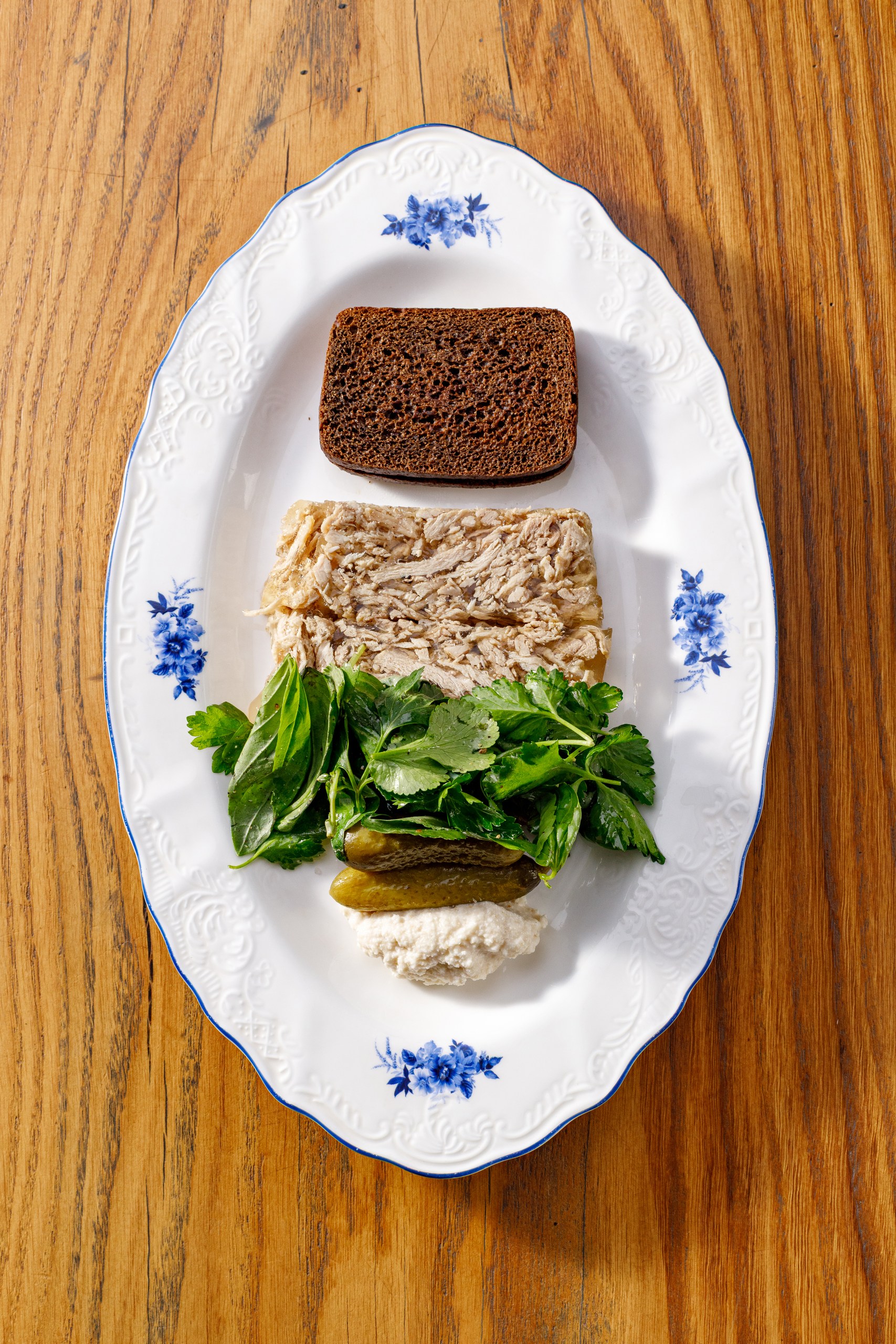 Холодец из свинины, сливочный хрен,темный хлеб, корнишоны, микс зелени